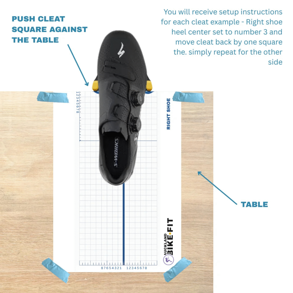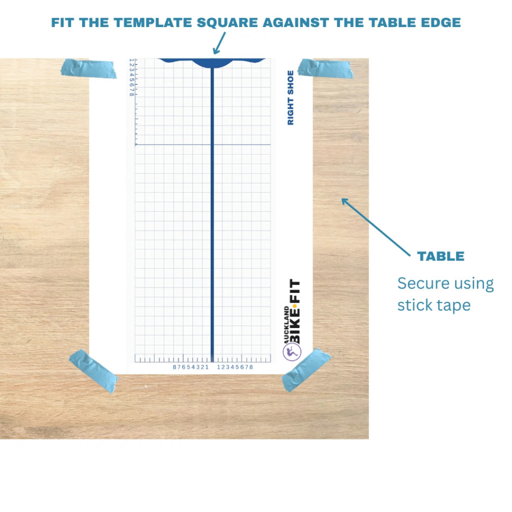 Slot your shoe over the template with nthe cleat square against the table and centered over the blue cleat area as per the diagram below